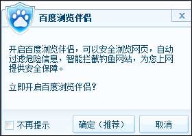 騰訊科技試用百度電腦管家之后稍許時(shí)間后,百度電腦管家自動(dòng)彈出一個(gè)“建議安裝百度瀏覽伴侶”的提示,該界面顯示開(kāi)啟百度瀏覽伴侶,可以安全瀏覽網(wǎng)頁(yè),自動(dòng)過(guò)濾危險(xiǎn)信息,智能攔截釣魚(yú)網(wǎng)站。